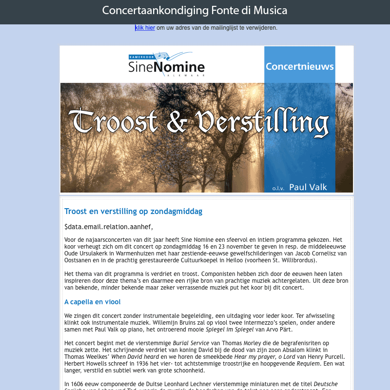 E-mailingsHet versturen van digitale nieuwsbrieven en e-mailings heeft een grote vlucht genomen. Er zijn verschillende systemen voor en ik help u graag bij het maken van een keuze hierin. Dan kunt u uw eigen adressenbestand opbouwen en de mailings ook zelf versturen. Als u (nog) geen eigen systeem wilt, dan kan ik ook incidentele mailings voor u verzorgen. RICH+